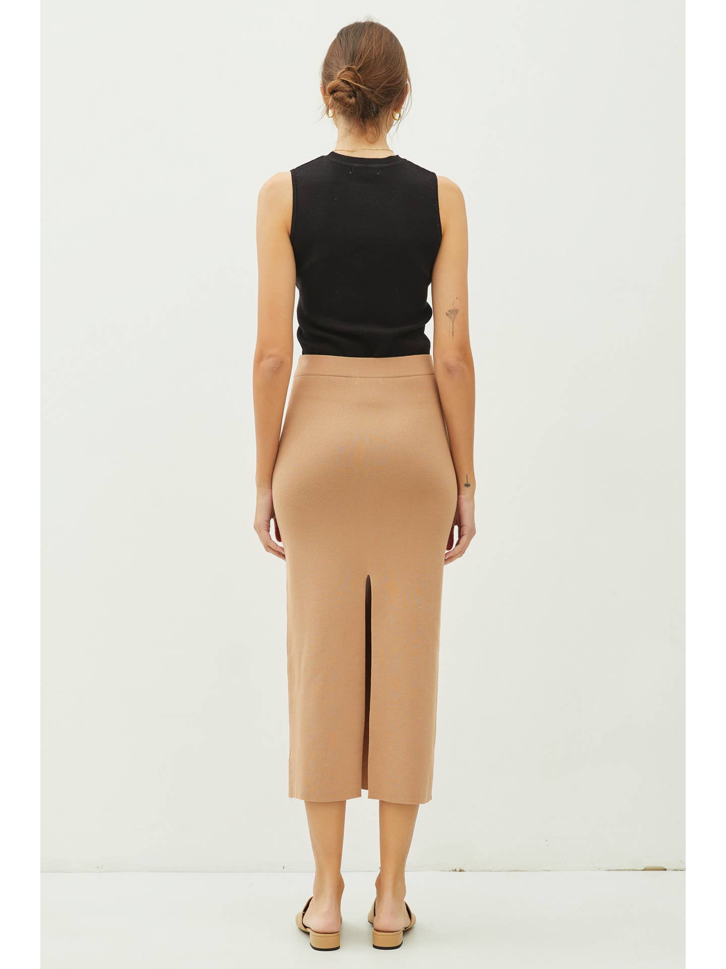 This camel-colored midi skirt features a high-rise, pull-on design with an elastic waistband for comfort. Crafted from a midweight knit jersey blend of 60% viscose and 40% nylon, it offers a fitted, slim silhouette with a chic pencil shape. The skirt includes a subtle back slit and embodies a casual, minimalist aesthetic, making it an elegant choice for everyday wear.