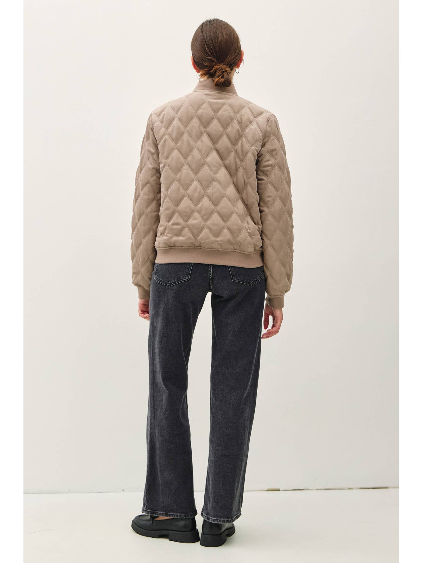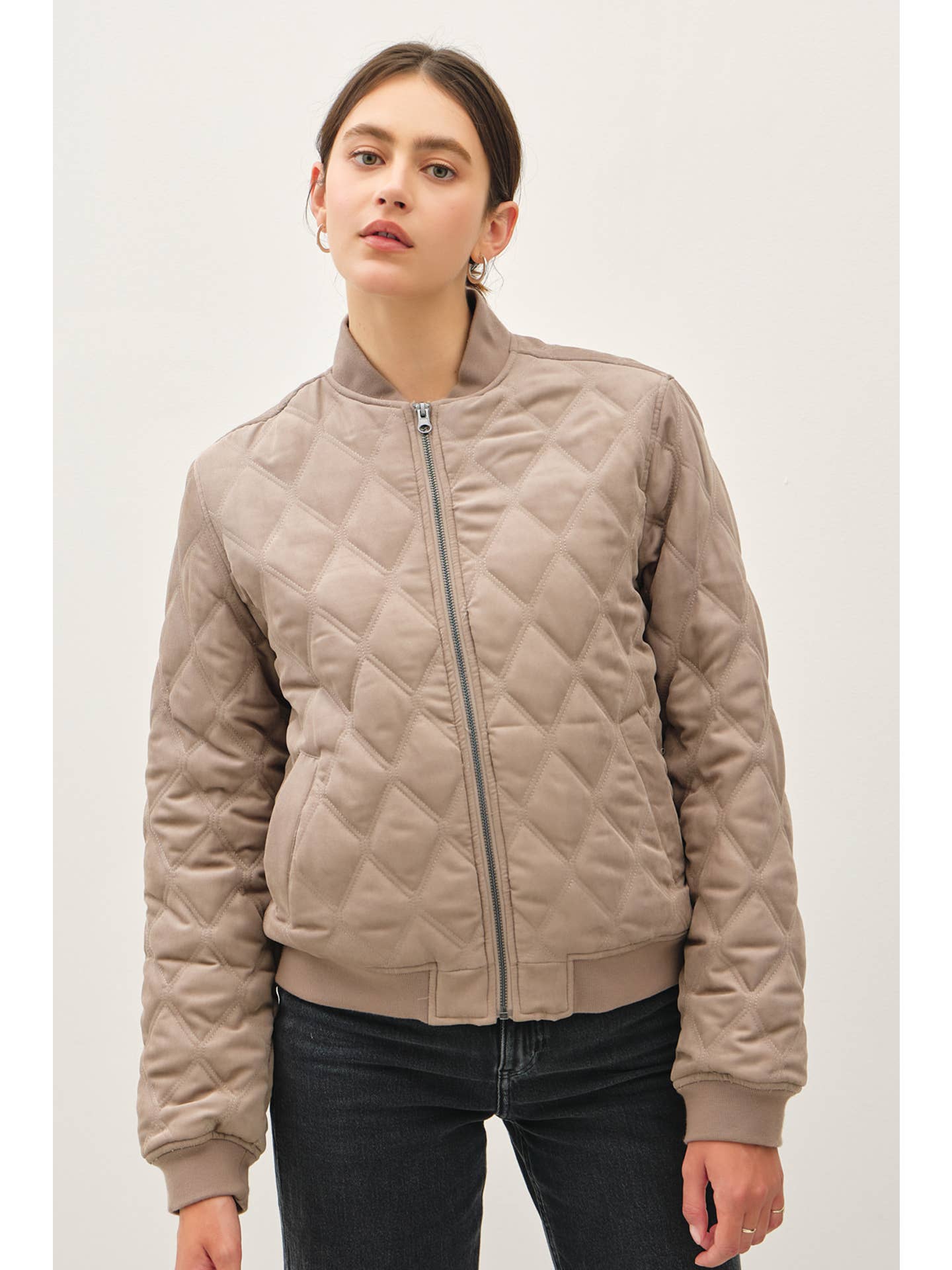 This Earth Grey bomber puffer jacket features a distinctive diamond quilted design, complemented by side welt pockets and a front zipper closure. Crafted from a blend of 97% polyester and 3% nylon, it offers a contemporary fit with long sleeves and ribbed elastic cuffs. Ideal for fall and winter layering, this jacket combines casual charm with a vintage-inspired aesthetic.