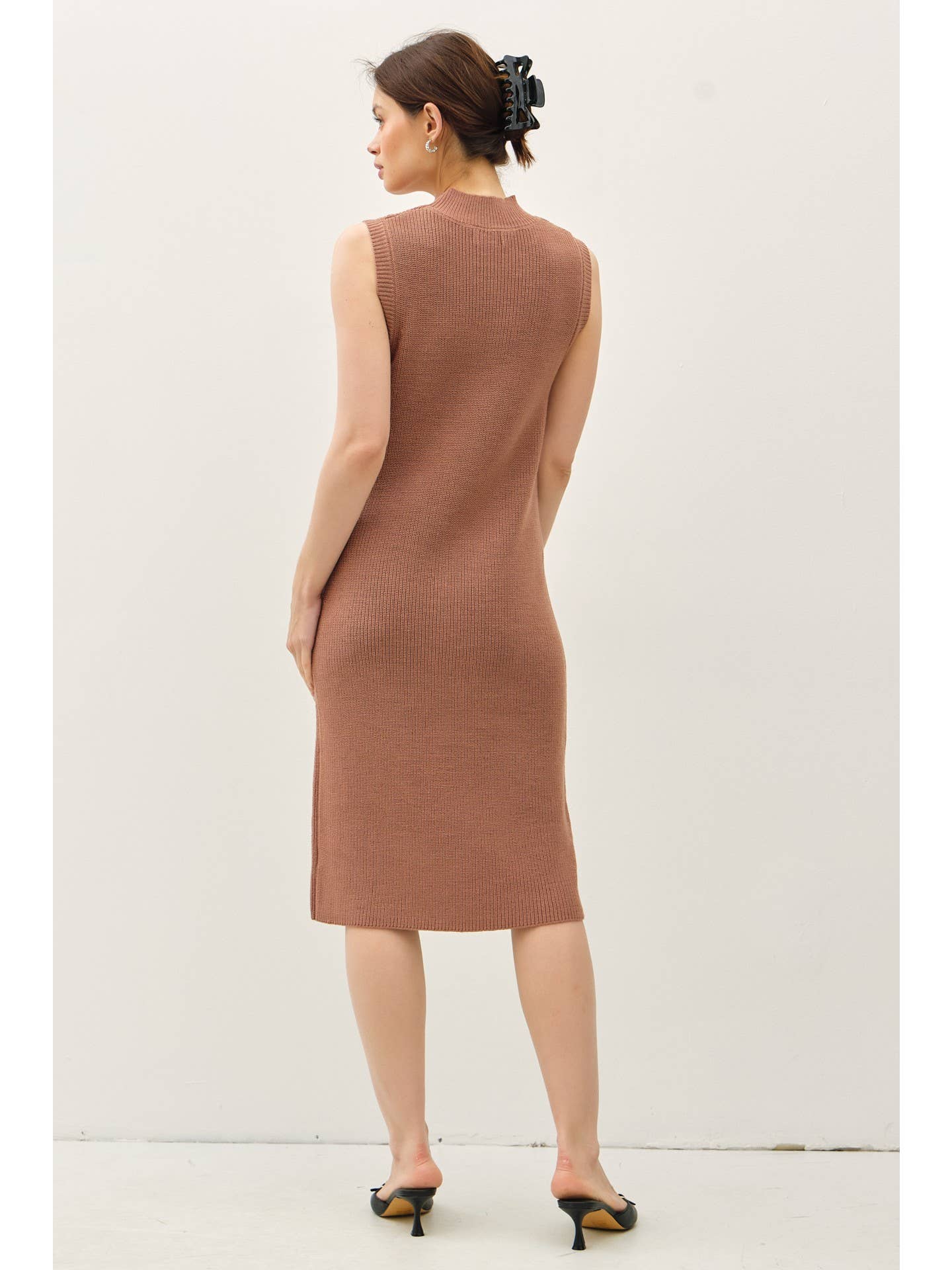 This sleeveless sweater dress features a mock neck and falls to the knee, crafted from a medium-weight wool blend for warmth and comfort. Its chunky texture and terracotta hue offer a refined yet understated look, perfect for both everyday wear and special occasions. Designed with a contemporary fit, this elegant piece combines casual charm with classic sophistication. Made from 75% acrylic, 10% nylon, and 15% wool, it delivers both style and cozy practicality.