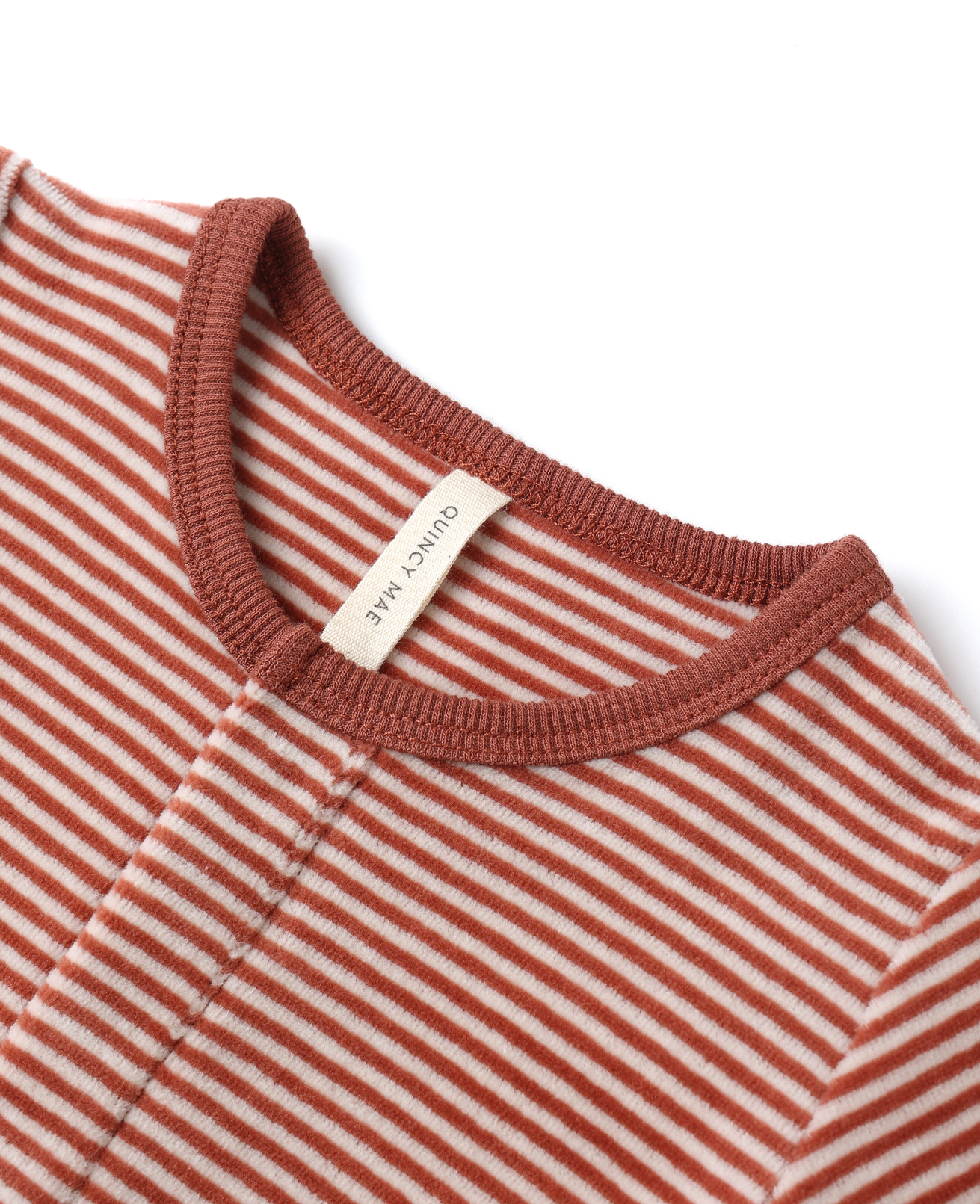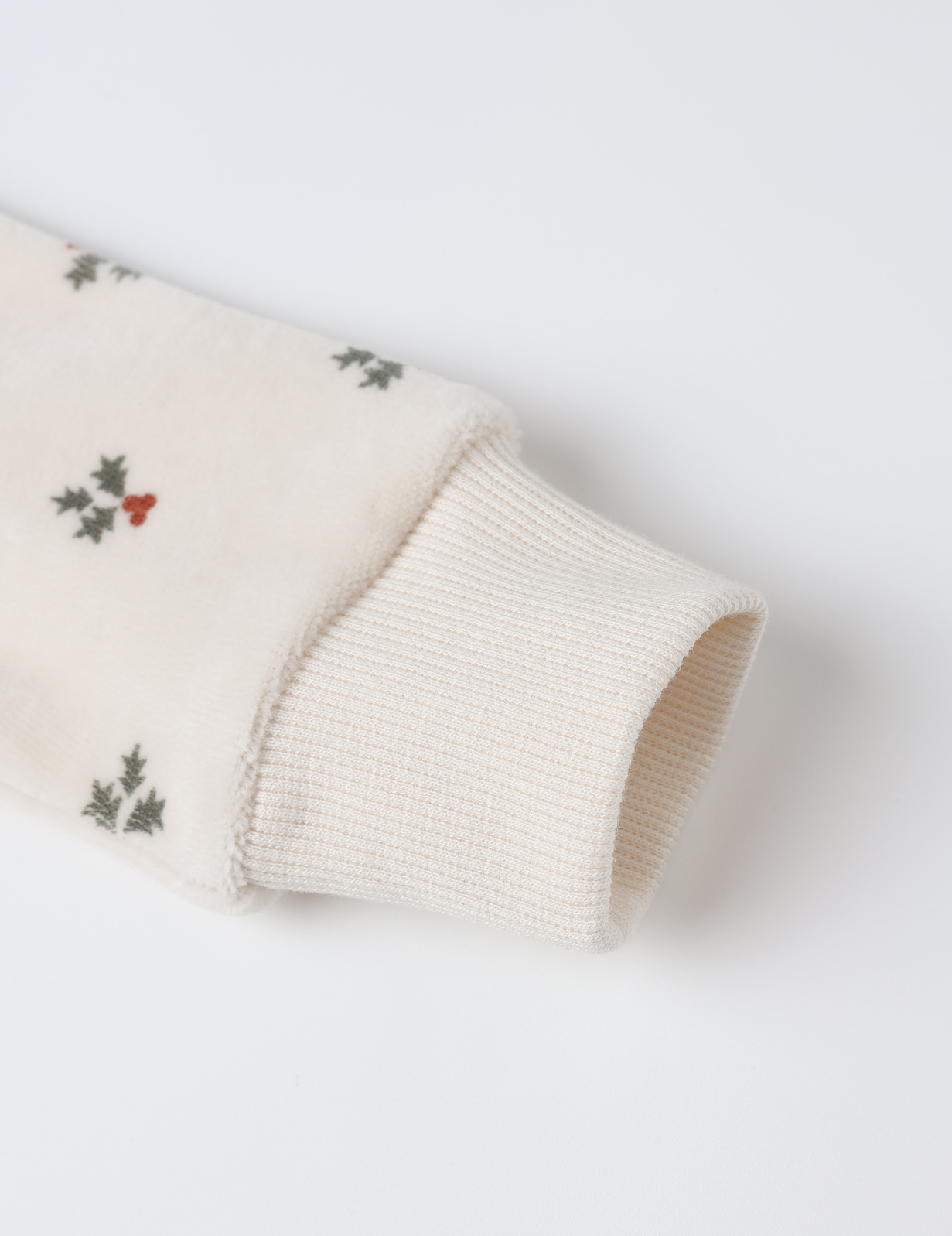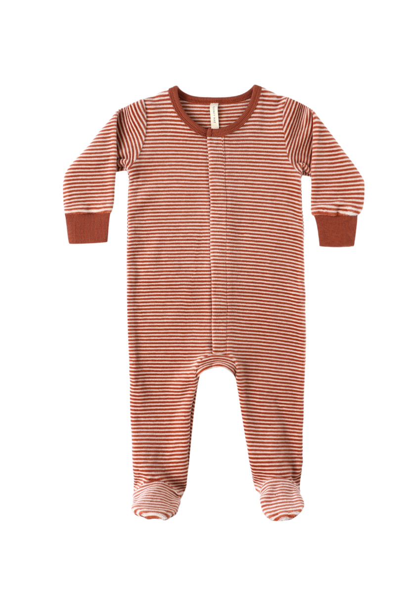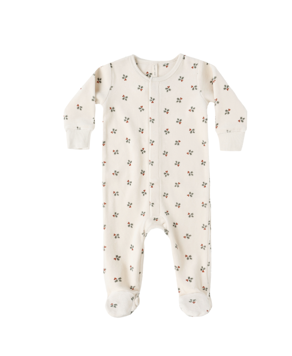 Experience comfort with our hidden snap footie, offered in a natural holly berry shade and a cranberry candy stripe. Crafted from 100% organic cotton, it delivers a soft and cozy feel perfect for delicate skin.