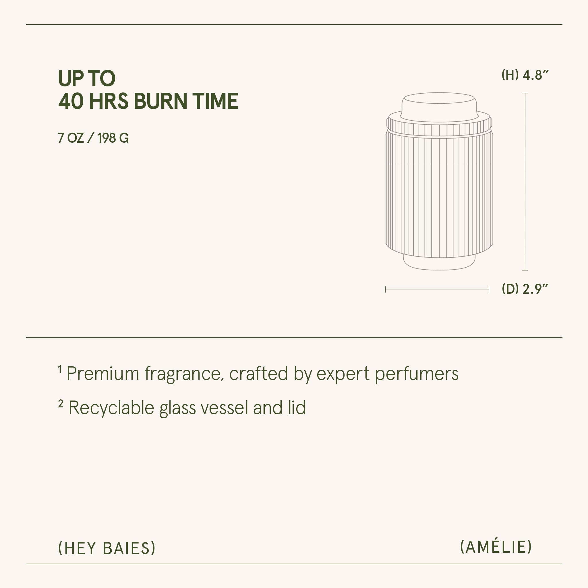 Elevate your space with Amélie 7 oz candle: Timeless ribbed glass candles, reminiscent of the Acropolis grandeur. Available in calming colors, they offer a sustainable 40-hour burn with natural soy wax and seamlessly become elegant keepsake containers. Luscious cassis, vibrant red currant, and exotic passionfruit evolves into a floral heart, while a base of earthy patchouli, enchanting oakmoss, and sensual musk creates an unforgettable and alluring fragrance experience.