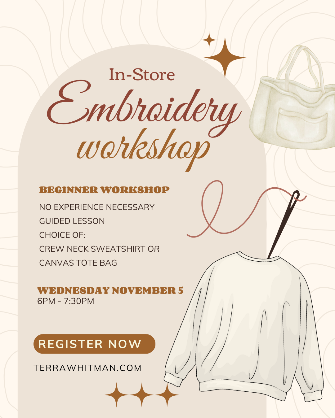 All workshops are beginner-friendly and introduces the basics of hand embroidery - perfect for anyone looking to try a fun, creative activity. Guests will be provided with either a canvas tote bag or a crewneck sweatshirt (depending upon their selection at sign up and purchase) and a beginner’s embroidery kit with the necessary supplies to complete the project - theirs to keep! No prior experience needed.