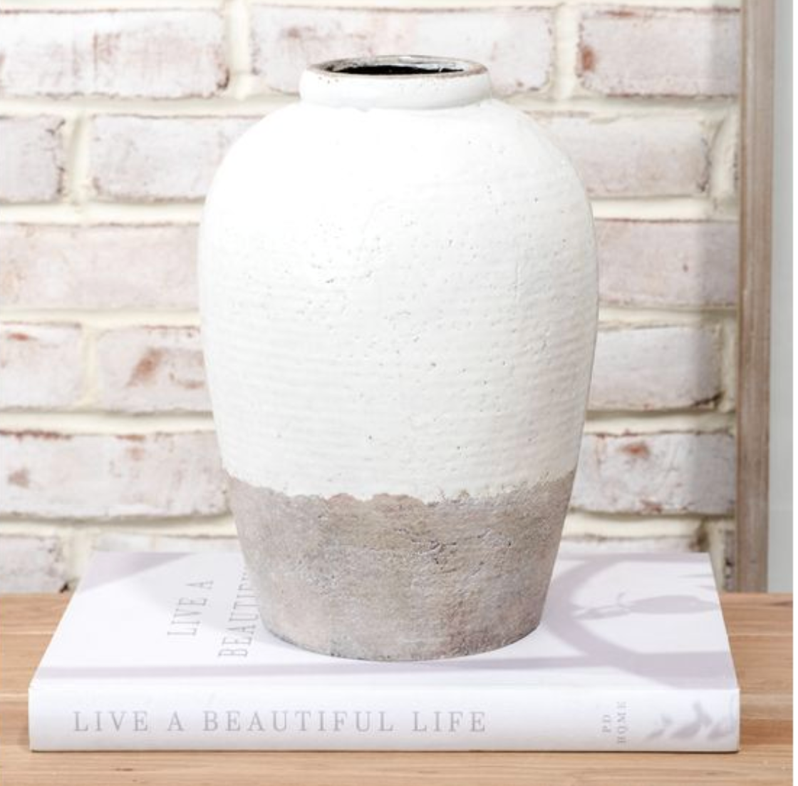 This elegant French white vase is offered in both small and large sizes. The small measures 7.9 x 7.9 x 8.9 inches, while the large measures 7.9 x 7.9 x 11 inches, making it a refined addition to any interior.